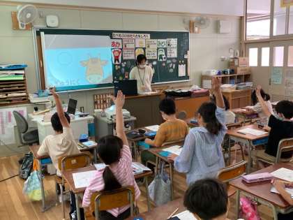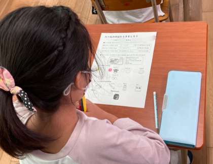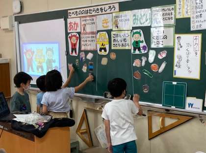 区内から栄養教諭の方に来ていただき、「食べ物のはたらきを知ろう」を学習しました。肉、野菜、ご飯、牛乳などの食べ物は、3つのはたらきに分けることができ、「赤」は体をつくるもとになる、「黄」はエネルギーのもとになる、「緑」は体の調子を整えるもとになることを知りました。給食に使われている食べ物を、はたらきで3つの色にわけました。