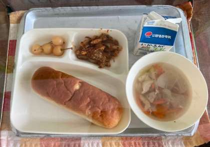 献立は、なすのミートグラタン、鶏肉と野菜のスープ、さくらんぼの缶詰、おさつパン、牛乳です。
