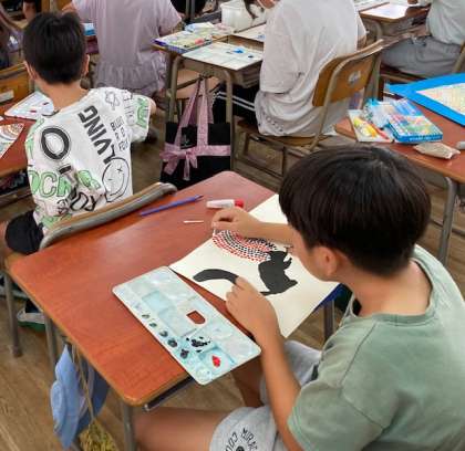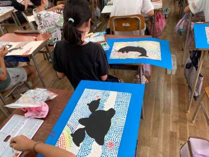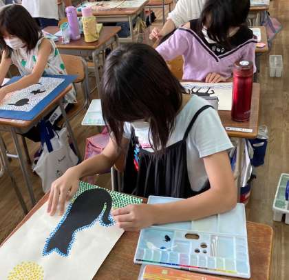 5年生がアボリジナルアートに取り組んでいます。アボリジナルアートは、オーストラリアの先住民のアボリジニの人々により描かれたアートです。特徴は、ドットペインティングです。子どもたちはとても集中して取り組んでいました。完成が楽しみです。