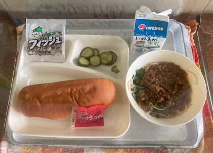 献立は、タンタンめん、きゅつりの甘酢づけ、ミニフィッシュ、パン、いちごジャム、牛乳です
