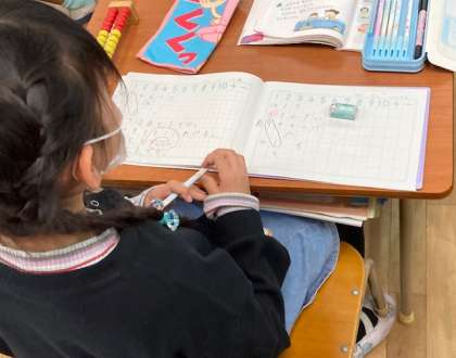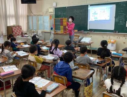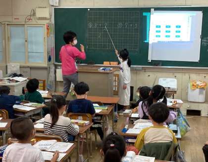 1年生の算数の学習は、たし算をしています。和が10より大きい数になるたし算は、数を分解して足して10を作ります。10と分解して残った数を足します。「さくらんぼを作りましよう」と、担任は指導しています。