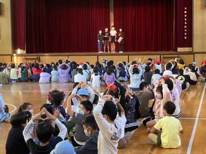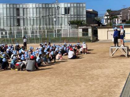 毎週木曜日は児童集会があります。感染対策として、運動場と体育館にわかれて集会をしています。今日は○??クイズをしました。