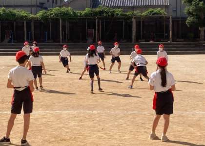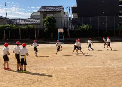 6年生が体育でタグラグビーの学習をしています。腰にタグをつけてタグの取り合いをしたり、ボールを持ってタグを取られないように走り抜けて行ったりする練習をしました。