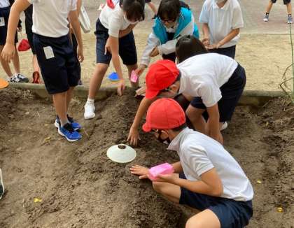 5年生がなにわの伝統野菜の学習に取り組んでいます。今日は、天王寺かぶらの種を学習園に植えました。種がとても小さくて軽いことに、子どもたちは驚いていました。