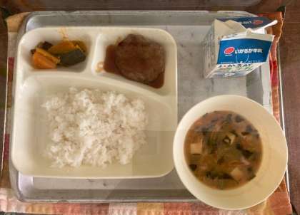 ?献立は、和風ハンバーグ、みそ汁、かぼちゃのいとこ煮、ご飯、牛乳です。