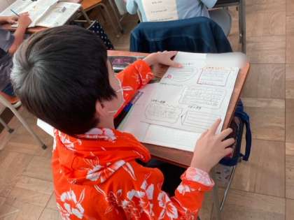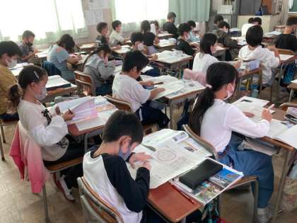 4年生が社会科で天神祭について、天神祭はどんな祭、歴史、天神祭を支える人々、天神祭の課題、学習した感想を学習プリントに書きました。