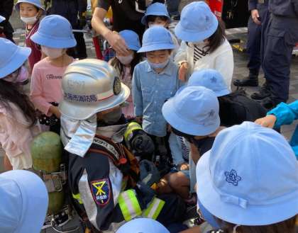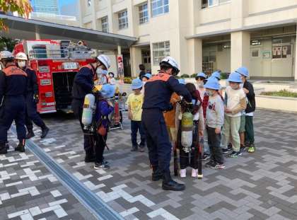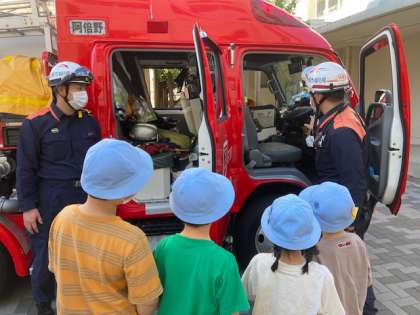 消防士さんのお仕事を教えてもらいました。また、消防車の内部を見せてもらいました。