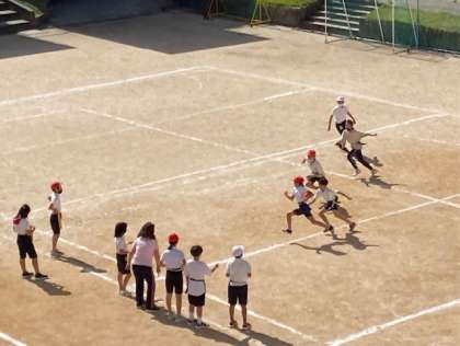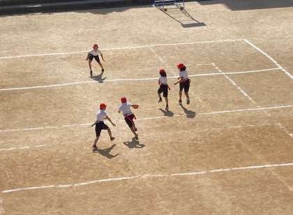 5年生が体育でタグラグビーをしています。腰につけたタグを取られないように、どのように動くかチームで考えてアタックします。