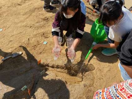予想した通りに、地面が削れていくかを旗をたてて確認しています。