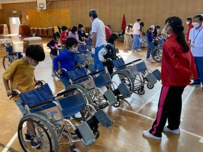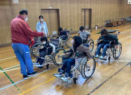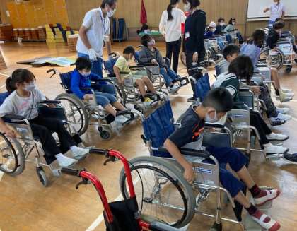 3年生が車いす体験をしました。車いすの扱い方、操作の仕方などを教えてもらいました。体育館に作られたコースを車いすに乗って移動しました。