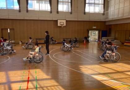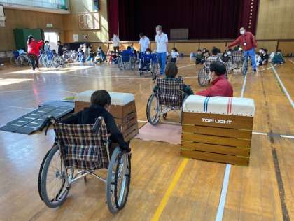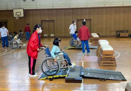 車いすに乗って坂道を通り、コーンを回り跳び箱で作った細い道を通り過ぎ、段差を乗り越えてゴールしました。なかなか難しかったです。