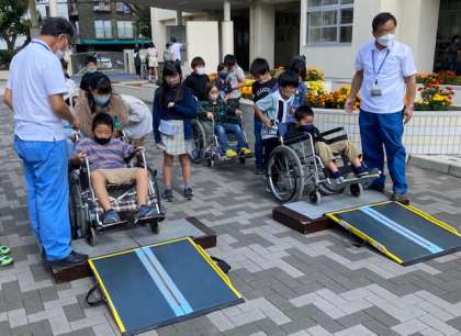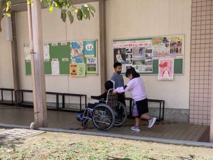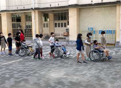 花の広場に車いすのコースを作りました。車いすに乗る人、押す人に分かれて体験しました。段差を乗り越えるのが難しかったですが、安全に車いすを操作できました。貴重な体験を指導していただき、リハビリテーションセンターの皆さんありがとうございました。