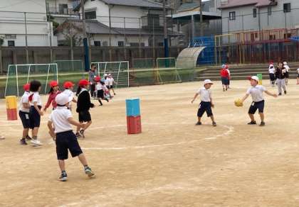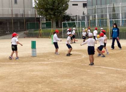 2年生が体育でボールあてゲームをしています。段ボール箱にボールを当てられないように守っています。