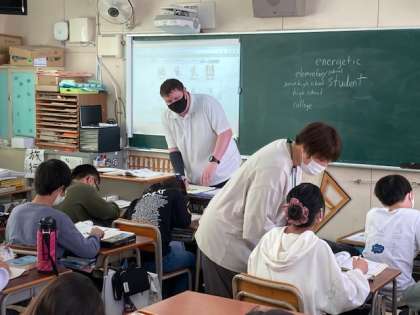 6年生が担任の先生とC-NETの先生と一緒に、外国語(英語)の学習をしました。有名人を紹介するクイズを作成しました。