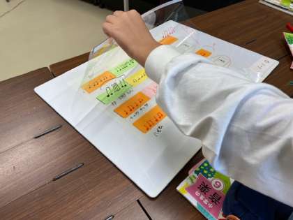 班で話し合いながらリズムを組み立て、音楽をつくりました。