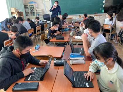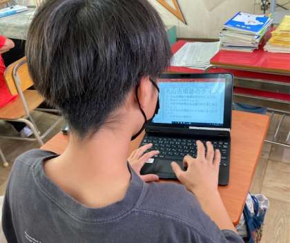 6年生が総合的な学習の時間に、地域の史跡などを調べ、それをパワーポイントを使ってまとめました。完成後は、プレゼンをします。ICT教育アシスタントさんに教えてもらいながら作成しました。