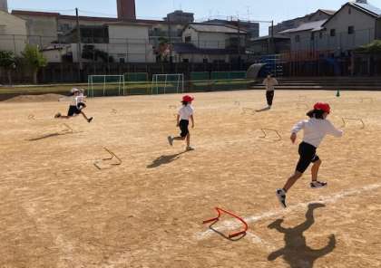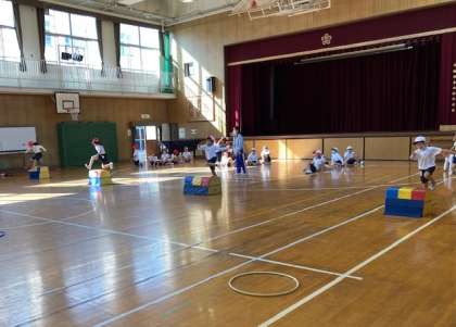 3年生の体育は、走・跳の運動です。運動場では、小型ハードルを調子よく走り越えることができるように練習しました。体育館では、跳び箱を跳びこえ、プールを走り超える練習をしました。