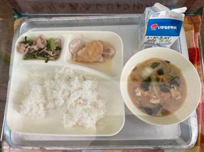 献立は、鶏肉のおろしじょうゆかけ、みそ汁、こまつなのいためもの、ご飯、牛乳です。