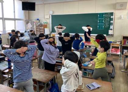 金曜日の朝は姿勢体操と健康調べです。保健委員の児童が教室に行き、姿勢体操の指導とハンカチやティッシュを持っているか、マスクをしているかを確認しています。来週は、健康週間です。