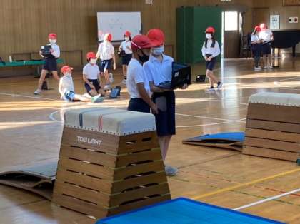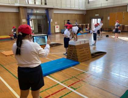 4年生の体育は学級担任ではなく、学年の先生が指導しています。今日は開脚跳びの練習をして、跳んでいる様子をタブレット端末で撮影をしました。動画を見て、お互いにアドバイスをしました。