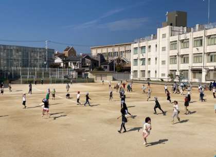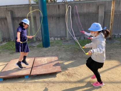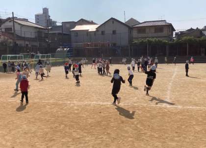 今日はおだやかな陽気のためか、普段より多くの子どもたちが運動場で遊んでいます。担任の先生と鬼ごっこをしたり、なわとびをしたり、ドッチボールをしたりと、楽しく遊んでいます。
