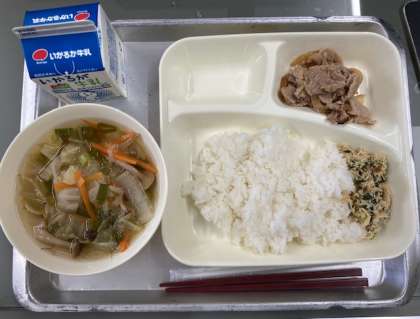 献立は、豚肉のスタミナ焼き、すまし汁、とりなっ葉いため、ご飯、牛乳です。本日の給食にしめじが登場しました。にんにくは青森県産です。