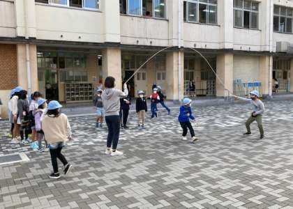 休み時間に大縄跳びをしている学級があります。担任の先生がなわを回して8の字とびに挑戦しています。