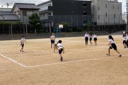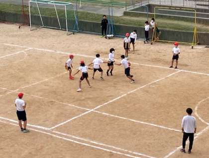 5年生の体育は、タグラグビーです。ラグビーのタックルの代わりに、腰につけたタグを取ります。チームで動き方を考えてボールを運んでいます。