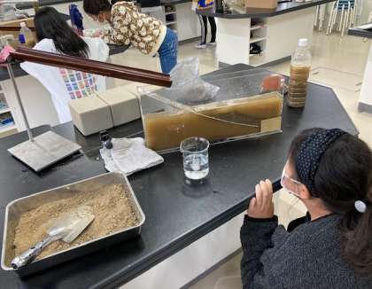 6年生が理科「地層のでき方」を学習しました。水の働きによる地層のでき方を実験しました。礫、砂、泥がどのように堆積するか調べました。