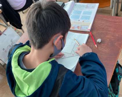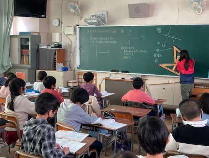 4年生の算数は、2本の三角定規を使って点Aを通り、アの直線に垂直な直線をひく学習をしました。2本の三角定規のどのように置けば、垂直な直線をひけるのか考えました。