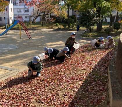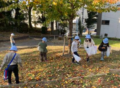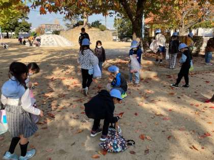 1年生が公園たんけんに出かけました。赤や黄色に色づいた木々がある公園で、落ち葉を拾い集めました。たくさん集めた葉っぱは、生活科の授業で使います。
