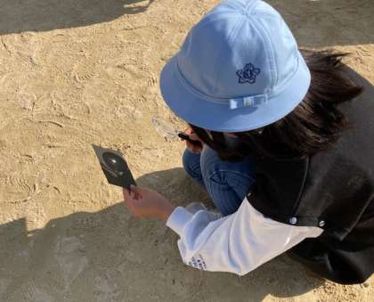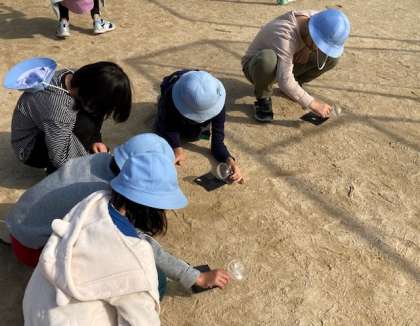 3年生が太陽の光を虫めがねで集める実験をしました。光があたったところは、より明るくあたたかくなることがわかりました。