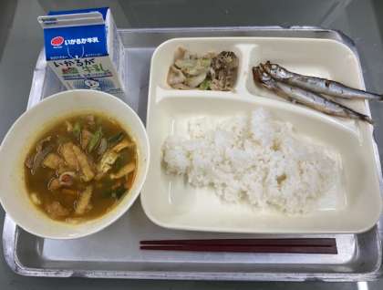 献立は、焼きししゃも、和風カレー汁、まいたけとキャベツのいためもの、ご飯、牛乳です。秋のきのことして、給食にまいたけが登場しました。