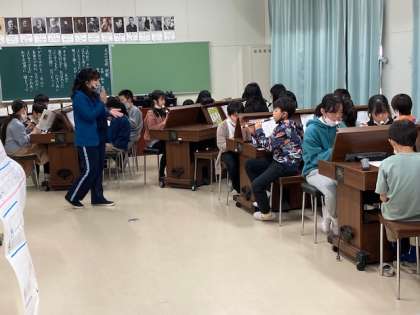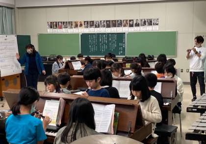 5年生が威風堂々の曲をリコーダーで演奏する練習をしました。繰り返しがあるので、間違わないように練習しました。