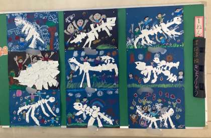 1年生の学年掲示板には「ほねほねきょうりゅう」が、掲示されています。