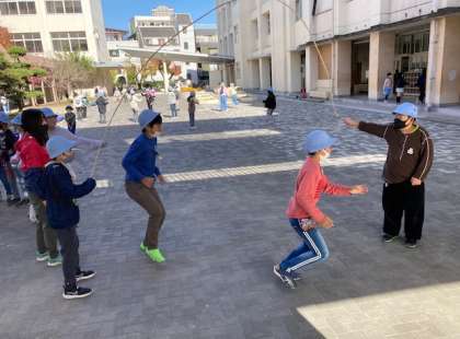 15分休みに運動場でなわとびに取り組む学年は、3年生と5年生です。また、休み時間には花の広場で大なわとびに取り組むクラスもあります。体力作りに積極的に取り組んでいます。