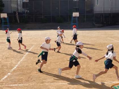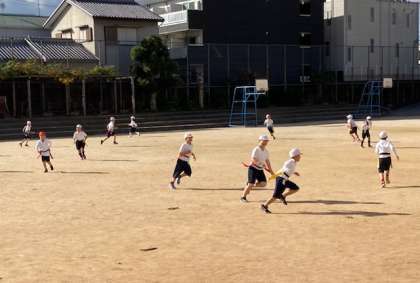 2年生は、タグを腰につけてタグ取りゲームをしました。おに遊びのひとつです。俊敏な動きでタグを取られないようにしていました。