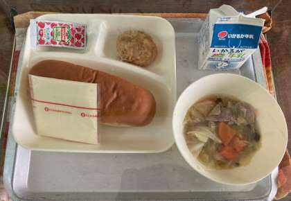 献立は、とうふハンバーグ、カリフラワーのスープ煮、スライスチーズ、黒糖パン、牛乳です。冬の旬の野菜として、カリフラワーが給食に登場しました。