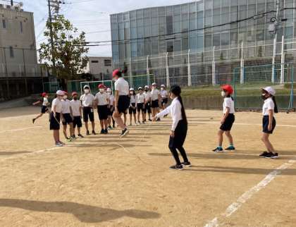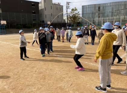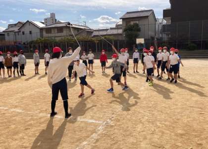 15分休みの時間に、4年生と6年生が大縄跳びの記録会をしました。3分間で跳べる回数を数えました。声をかけ合い、力を合わせて跳んでいました。