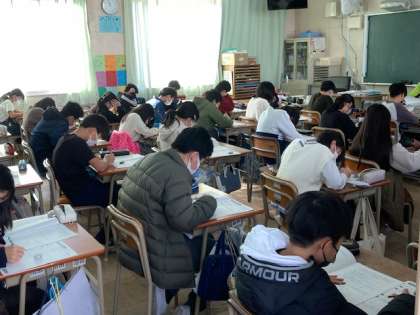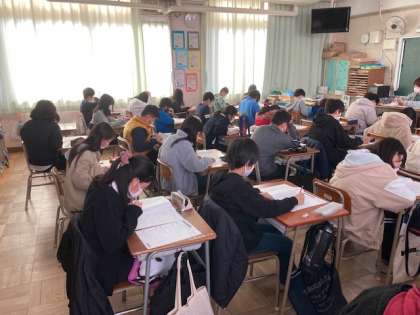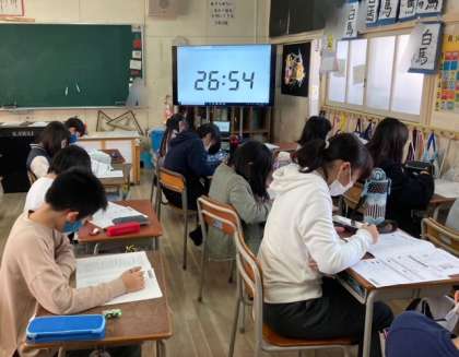 5年生と6年生の教室では、とても集中して最後まであきらめずに問題に取り組んでいました。国語では、聞き取り問題もありました。