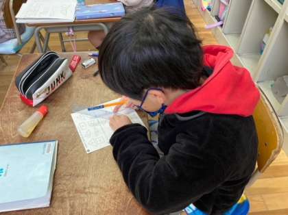 2年生が算数「三角形や四角形がわかるようになろう」を学習しました。三角形とにかく四角形の特徴を理解して、実際に三角形や四角形を書いてみました。