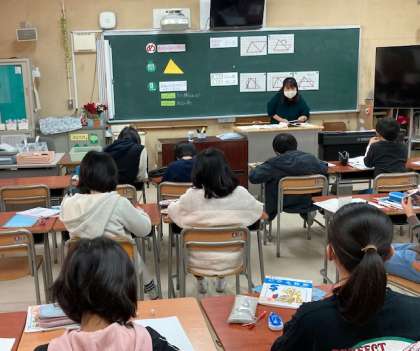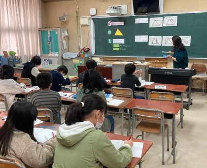 5年生が算数「四角形と三角形の面積」を学習しています。学級2分割の習熟度別少人数授業で行いました。平行四辺形、長方形、正方形など面積の求め方がわかっている形に変えて考えました。