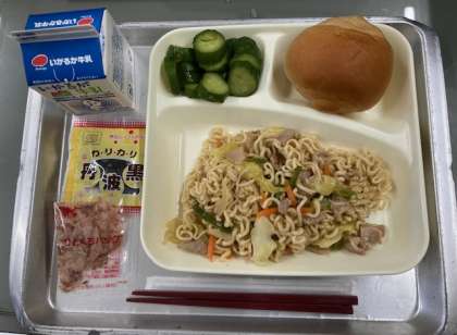 献立は、和風焼きそば、きゅうりのしょうがづけ、いり黒豆、ミニ黒糖パン、牛乳です。