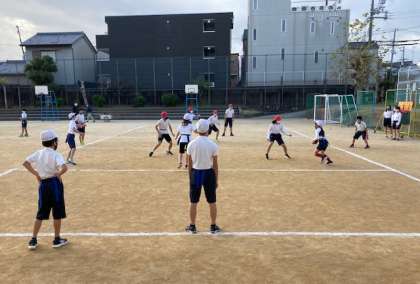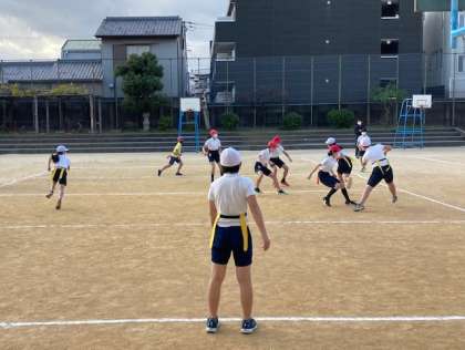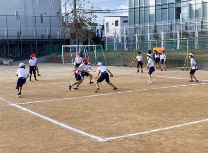 6年生が体育「タグラグビー」をしています。作戦を考えて、パスを上手に回して攻撃しています。今日は寒いですが、しっかりと動いています。