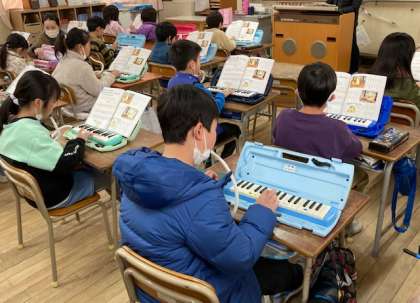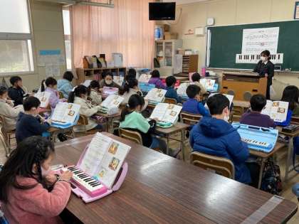 2年生の音楽は、鍵盤ハーモニカで小ぎつねを演奏する練習をしました。1小節ずつ練習していきました。場面の様子を思い浮かべながら、吹くことができました。
