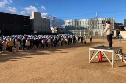 2学期最後の児童朝会を運動場で行いました。最初に読書感想文、防災の図画、大阪府学生科学賞、学校給食献立コンクール優秀賞の表彰がありました。