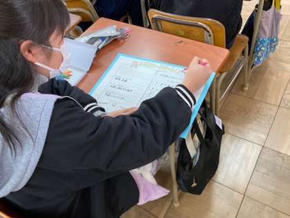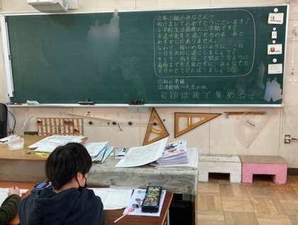 6年生が「あいうえお作文」で3学期の目標を書きました。3月17日の卒業式をめざし、最高の思い出をたくさん作ってほしいと思います。また、黒板には担任の先生からのメッセージが書かれていました。小学校生活を締めくくる大事な3学期です。有意義に過ごしてほしいと思います。