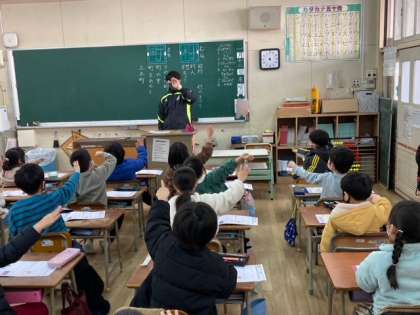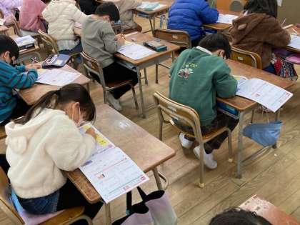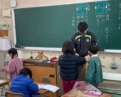 1年生が新出漢字を「村、町」を学習しました。空書きと指書きをしてから、ドリルに書きました。書いた後は、先生の点検を受けます。丁寧に書けていました。