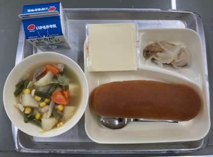 献立は、あじのレモンマリネ、てぼ豆のスープ煮、スライスチーズ、黒糖パン、牛乳です。