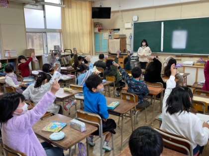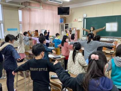 金曜日の朝は、保健委員会の児童が各教室に行き、姿勢体操をします。気持ちも体もスッキリして、1時間目の学習に入ることができます。姿勢体操終了後は、ハンカチ、ティッシュ、マスク着用などの健康調査をしました。